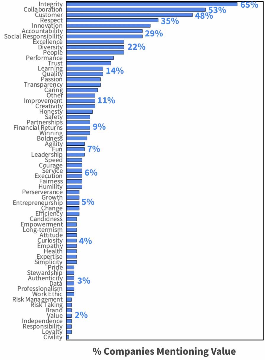 The long-tailed distribution suggests there are a handful of values that are ubiquitous, such as integrity and collaboration, which each appear in over half the websites.
