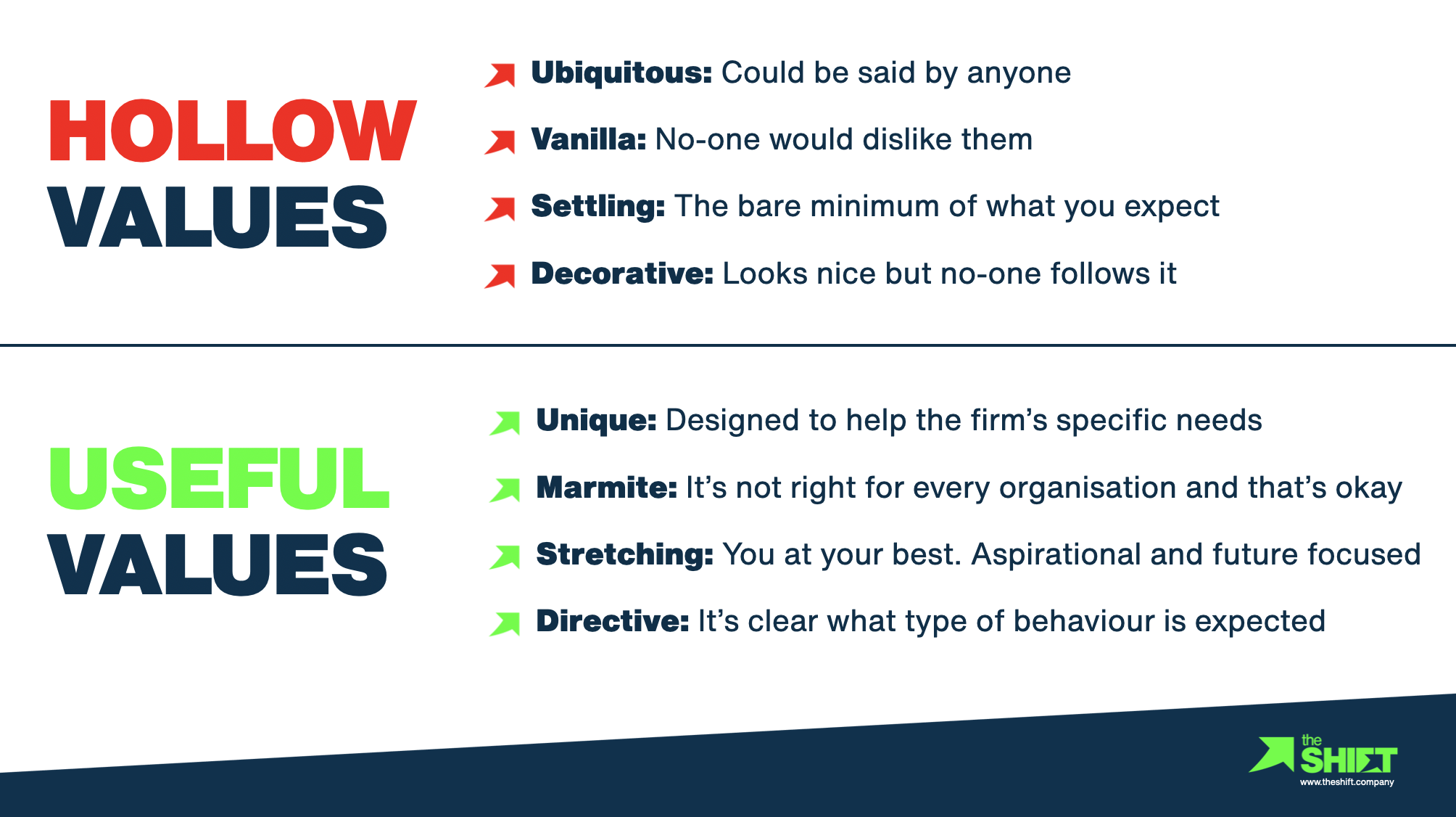 But when values are done well, when they are uniquely designed to serve your organisation’s strategy and culture; when they guide behaviour; when they shape decisions; when they act as a call to action…